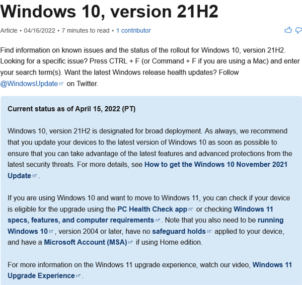 微软希望消费者知道Windows 10,21H2版本现在被归类为广泛部署状态,