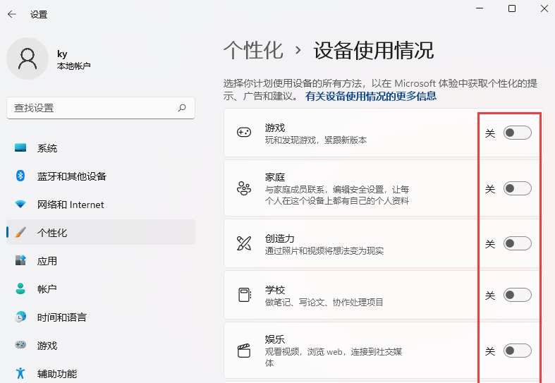 4、当前路径为:个性化>设备使用情况,默认所有的选项都是没有开启的,如果有需要开启,只需要找到对应的项,滑动滑块,即可开启;