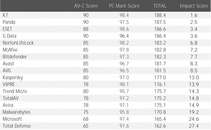 本栏基本上是总分数与190分之差。因此,影响分数越大,抗疟软件应用对测试系统性能的影响更大。例如,例如,考虑微软辩护人。其影响得分为24.6%。这意味着得分比总共190点6.6分少24倍。即165.4分。