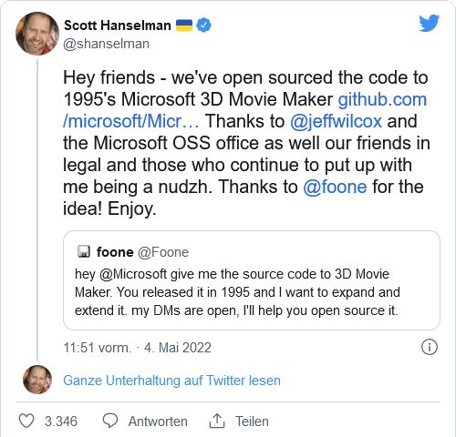 1995年,Windows 3D 电影制作器由微软发射。该方案面向青少年和家庭视频爱好者。三维物品可以放在预先反映的环境中。您也可以包括音乐、文字和许多附加效果。通过这种方式,任何人都可以做自己的短动画。现在,GitHub 上可找到此老旧程序的源代码 。