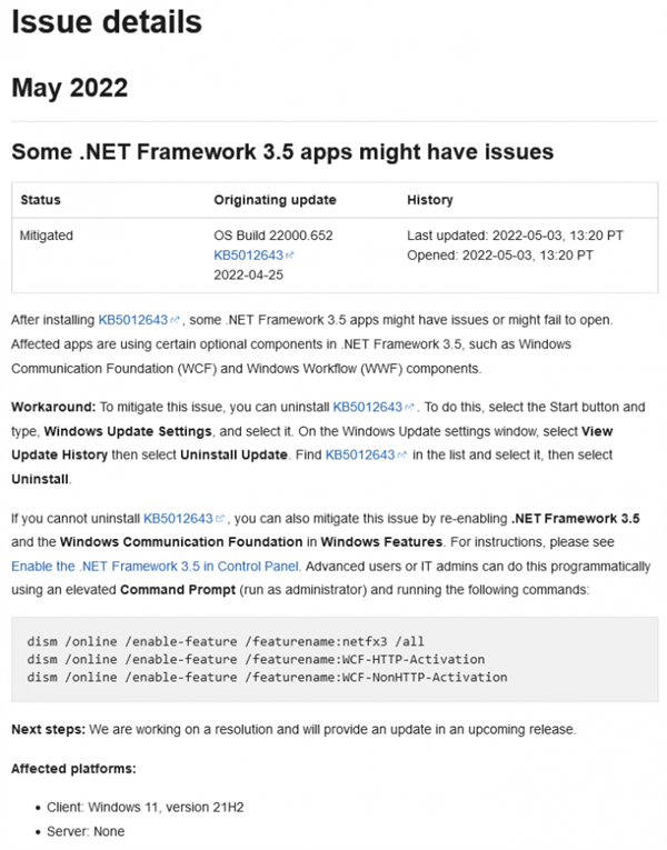 Microsoft没有就此发出正式通知。然而,随着Windows 11版第21H2版健康网页的发布,它介绍了已知问题。问题的标题告诉用户,随着KB5012643的安装,“一些..NET框架3.5应用程序可能会遇到问题。”