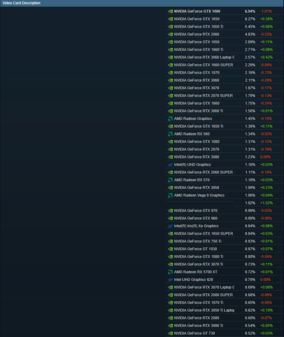 除系统外,Yvetteda GTX 1060的比例也在下降。目前的GTX 1650与第二位GTX 1650之间的差值进一步缩小。GTX 1050 Ti也显示出改善的迹象。RTX 3060移动版本是最新的30系列卡。英特尔Xe GPU市场份额达到零.94%。