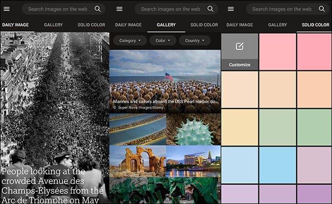 当安装和使用壁纸应用程序时,主页将显示搜索引擎的每日照片(以及选择时的照片的一些信息)、补充背景库和浅色壁纸。您可以通过这些选择滚动或使用搜索框搜索某些项目。