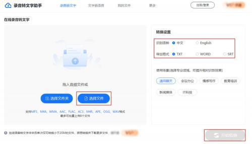 要允许转换, 请选择音频传输文本界面, 点击文件选择, 配置下面的输出格式, 识别语言, 然后点击“ 启动转换 ” 。