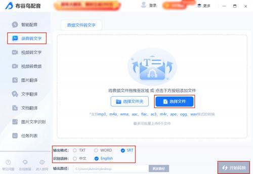要获取您想要的文本,请打开音频到文本帮助界面,单击选择文件以选择要转换的语音信息,然后修改 " 认可语言 " 和 " 导出格式 ",然后单击 " 开始转换 " 。