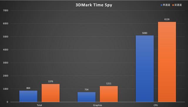 第一个是理论运行能力。3D Mark Fire Street SER4 单一频道共得2164分。整个两个频道共有3 503个频道。双频道的性能是单一频道的161%。3D Mark Timespy SER4 单频道得864分。整个两个频道共有1 376个频道。双道性能占单道性能的159.3%。火力攻击和时间间谍的得分是单一的图形。两道内存比单道内存高出60%以上。记录和档案管理带宽继续对核能见度产生重大影响。