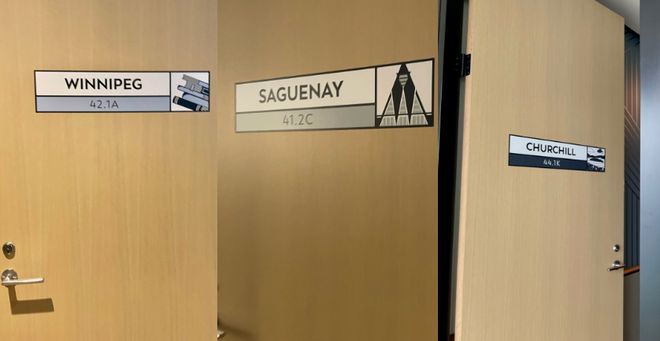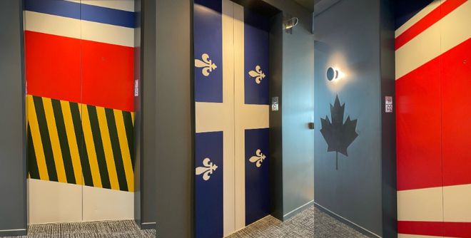 电梯装有来自若干省份的旗帜,会议室是以加拿大各城市或特点命名的。