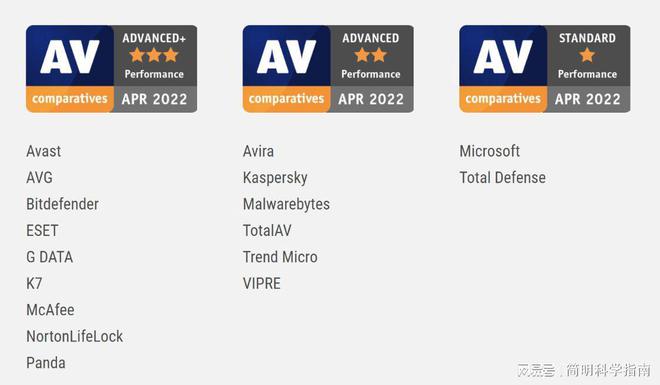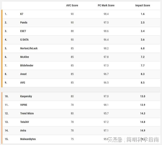 最后统计总分,最高性能是未知的 K7 。那只是一点影响,六点表现Panda也不错,ESET、GATA、Norton life Lock、McAfee和其他人接近名单的底部。AV比对授予三颗恒星至前九位。十到十五颗恒星获奖
