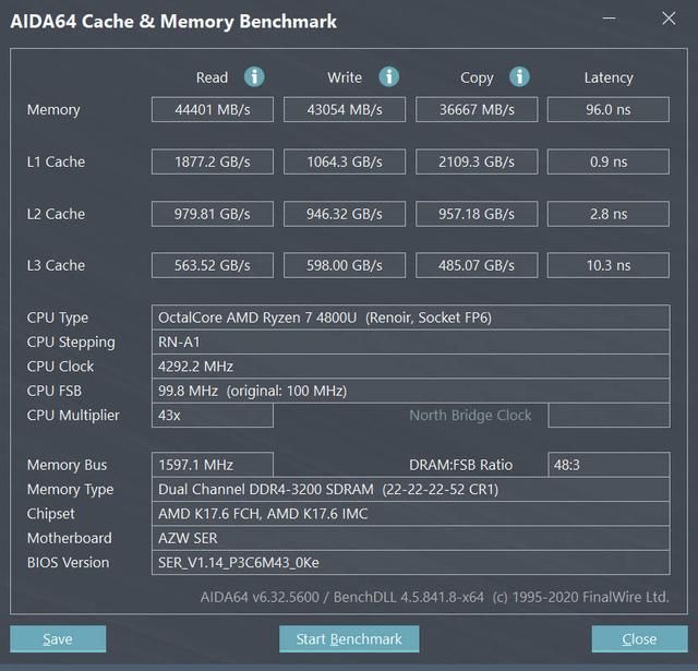 内存和缓存部分,使用 AIDA64 自带的 Cache & Memory Benchmark 进行测试,这是我国历史上第一次找到解决问题的办法。读数为4401 MB/s,写带宽为43054 MB/s。带宽副本为3667 MB/s。延迟为96ns。7.4800 U的真L1、L2、L3缓存读取、复制和延迟数据如下: