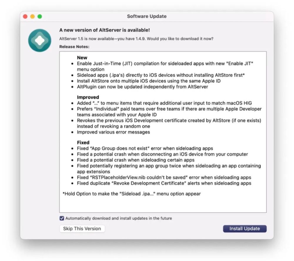 AltServer 应自动更新先前升级的用户。 您也可以手动更新到一. Version 5 。