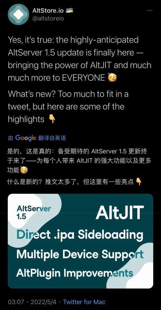 在阿尔特Stone团队的官方推特上,Alt Store团队将是AltServer v1.5, 也称为期待已久的释放。支持 AltJIT、 直接.ipa 侧加载、 多设备使用和邮件应用程序插件以及其他更改。