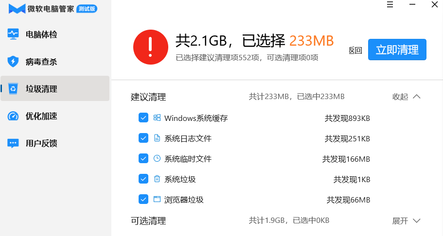 微软计算机管理员发现了2.1GB的垃圾文件,其中包括系统缓存、系统日志文件、系统临时文件等等。