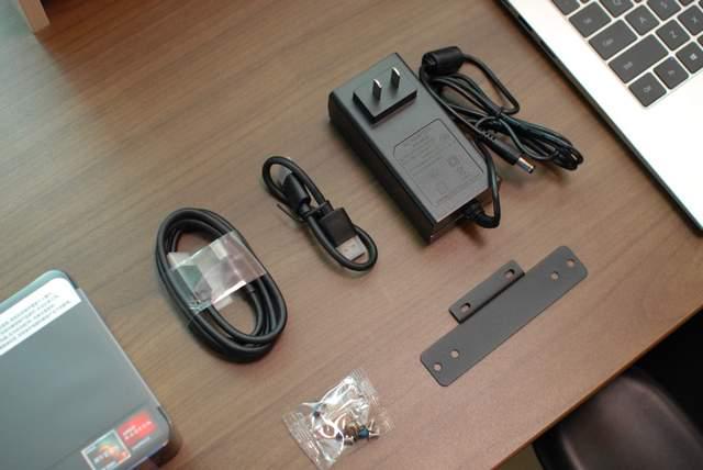 配件包括电源适配器、两条不同长度的HDMI线、墙壁支架和固定螺丝。