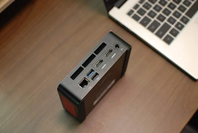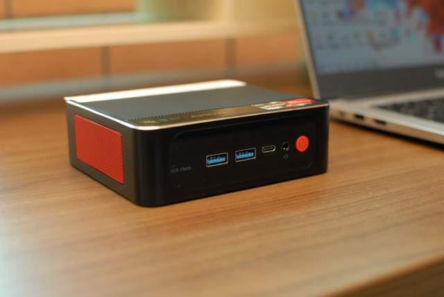 SER4微型PC的前端有两个USB3端口,一个无CCOS洞.0接口,一个C型端口,一个3.A 5毫米耳机插座和一个红色按钮。