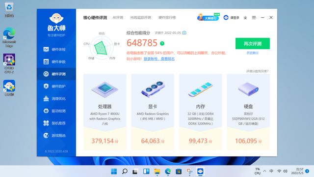 运行得分为648785分,CPU得分为379154分,卡分为64063分,内存得分为99473分,硬盘得分为106095分,总体表现良好。