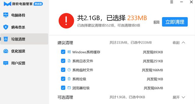 微软计算机管理员发现了2.1GB的垃圾文件,其中包括系统缓存、系统日志文件、系统临时文件等等。