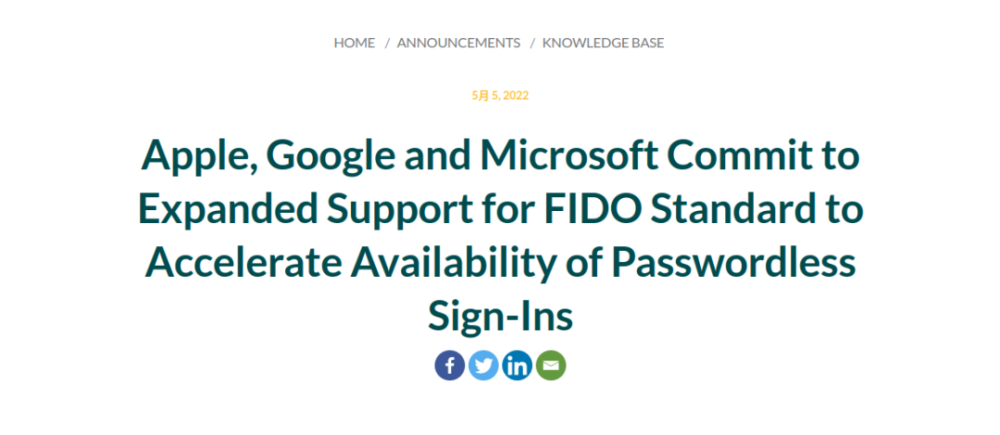 5 月 5 日,Apple、Google和微软发布公告:它将扩大对FIDO联盟和万维网联盟(W3C)全球无密码访问标准的支持。向客户提供一致、安全和简单的方式访问主要网站和应用程序,同时保密。支持不同的平台和设备。