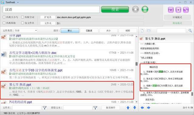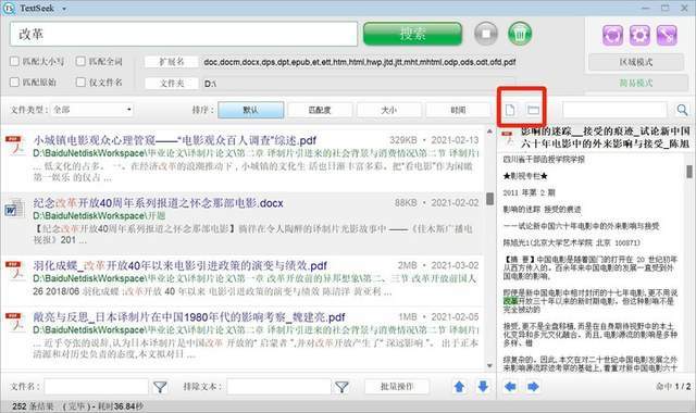 搜索完成后, 单击左窗口中的任何文件; 文本中的关键字将在右窗口中突出显示, 显示关键字的出现次数; 单击文本上方的页面和文件夹图标, 以即时查看文件或文件夹 。