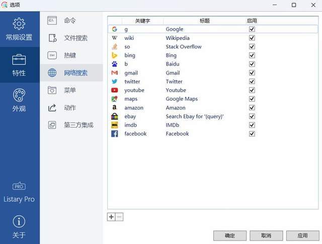 Listary 的网络搜索也很方便。 在搜索框中, 请输入匹配搜索引擎( 如 100 度( 默认为 b) ) 的关键词, 并按空间栏来完成关键词的相关引擎搜索 。