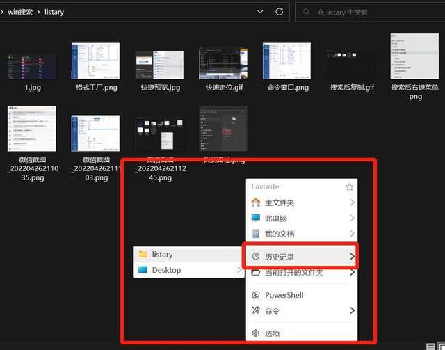启动 Listary 后, 双击计算机桌面或文件管理器空隙中的鼠标左键后, 将弹出一个列表菜单, 我们可以快速浏览电脑上任何地方, 或访问最近看到的文件夹 。
