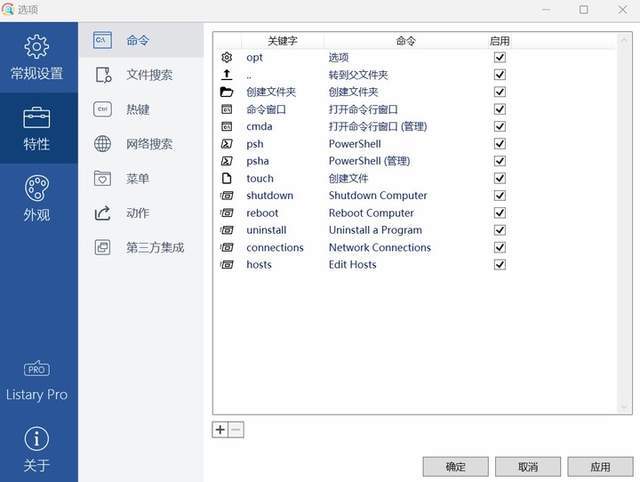 我们可以在设置中链接一些应用程序或文档和自定义关键字,使搜索更加简单。单击 " 特性 " 来定位命令设置选项。要添加命令,请单击 " + " 。