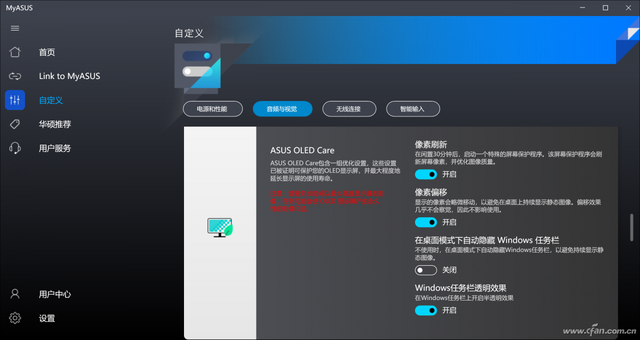 使用 MyASUS 软件用于 OLED 面板也使得像素更新、像素改方向、任务栏自动隐藏、黑暗模式能够防止屏幕燃烧的简单化。