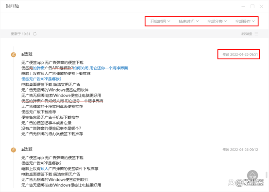 联网状态下,备份一个特定的时间轴,即使对材料做了许多调整,必要的文件可以查阅。一条内容中,蓝字体是全新的术语。红线已被删除 。您可以选择指定“ 启动” 和“ 结束” 时间 。您也可以从不同的类别和程序中选择。无法删除文件夹“{0}”。