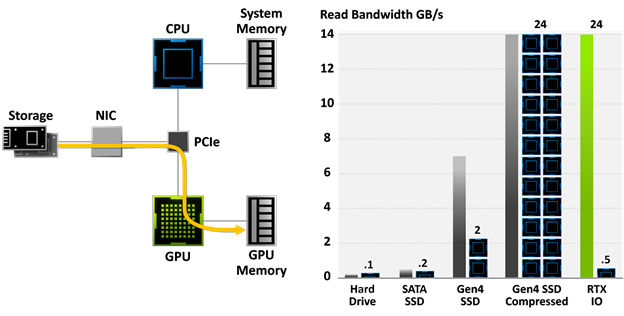 先前的游戏被装入, 即 GPU 通常需要传输到内存或定义的存储空间, 如果您想要调用硬盘内容, 并且, 如果使用压缩格式, 也需要 CPU 来解压缩内存, 然后通过 CPU, 然后 GPU 来进行创建、 计算等等 。