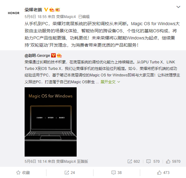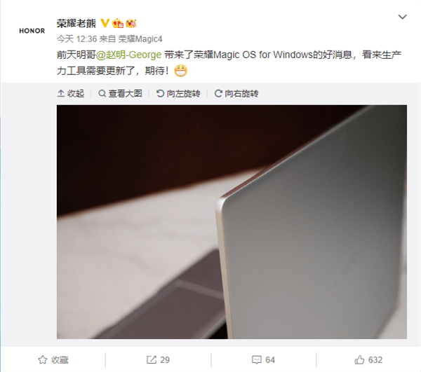 5月8日, Glory终端有限公司生产线副总裁@Emergence Bear披露了MigryBook笔记本电脑的新图像,暴露了Windows系统魔力操作系统的特点。