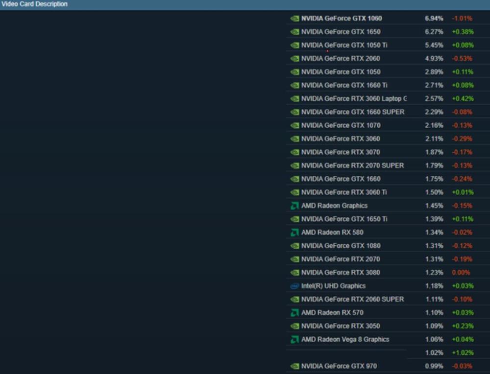 硬件方面,英国Weilda GTX1060卡在蒸气队名单中名列前茅,正在失去市场份额。还有六张,94%的蒸汽游戏员使用这张卡。GTX16050号是第二行这两张卡的分红进一步减少。差距在1%以内。