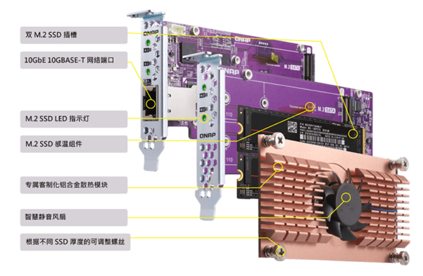 QM2-2P10G1TA是一张扩大卡,可容纳10,00兆吨和两个NVME SSD。NUS. NVME SD 2280/22110,PCIE2x4 传输带宽Aquattia AQC107负责。