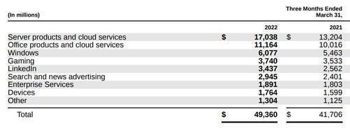 我们也渴望看到,随着一些工人返回各自的组织办事处,微软的庞大办公室和云层企业 是否保持了它们的势头?答案是明确的是肯定的: " 生产力和业务流程 " 类的收入在本季度增长了17%。商业部门办公室增加了12%,消费部门增加了11%。目前办公室有5 840万客户用户365人。这比上个季度增加了200万。从去年这个时候开始,增加了800万。“智慧云”的收入总体上增加了26%。达到191亿美元。