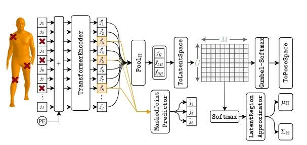 为了代表地图功能,研究人员提出了一个以变换器为基础的模型。在培训期间,利用自学技术了解身体各关节之间的相互作用。简而言之,向变压器输入 xH 和 beta 。并估计N(µH,∑H),H训练与甲骨文潜伏代码Z非常吻合