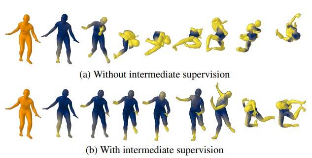 如图3a所示,中间分配的大部分明显变化后来发生。其中,人们注意到一种人性化的立场。研究人员认为,这是因为监督的唯一来源是GT职位,这显然领导了最后转换阶段。为了充分利用扇翼中每个可变区块 并简化训练他们主张实行中间监督。