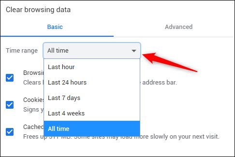 第一步是选择删除 cookie 和缓存的时间范围。 为此, 请单击时间范围旁边框架的箭头来扩展菜单, 然后选择所需的时间范围。 默认设置是“ 全部时间 ” 。