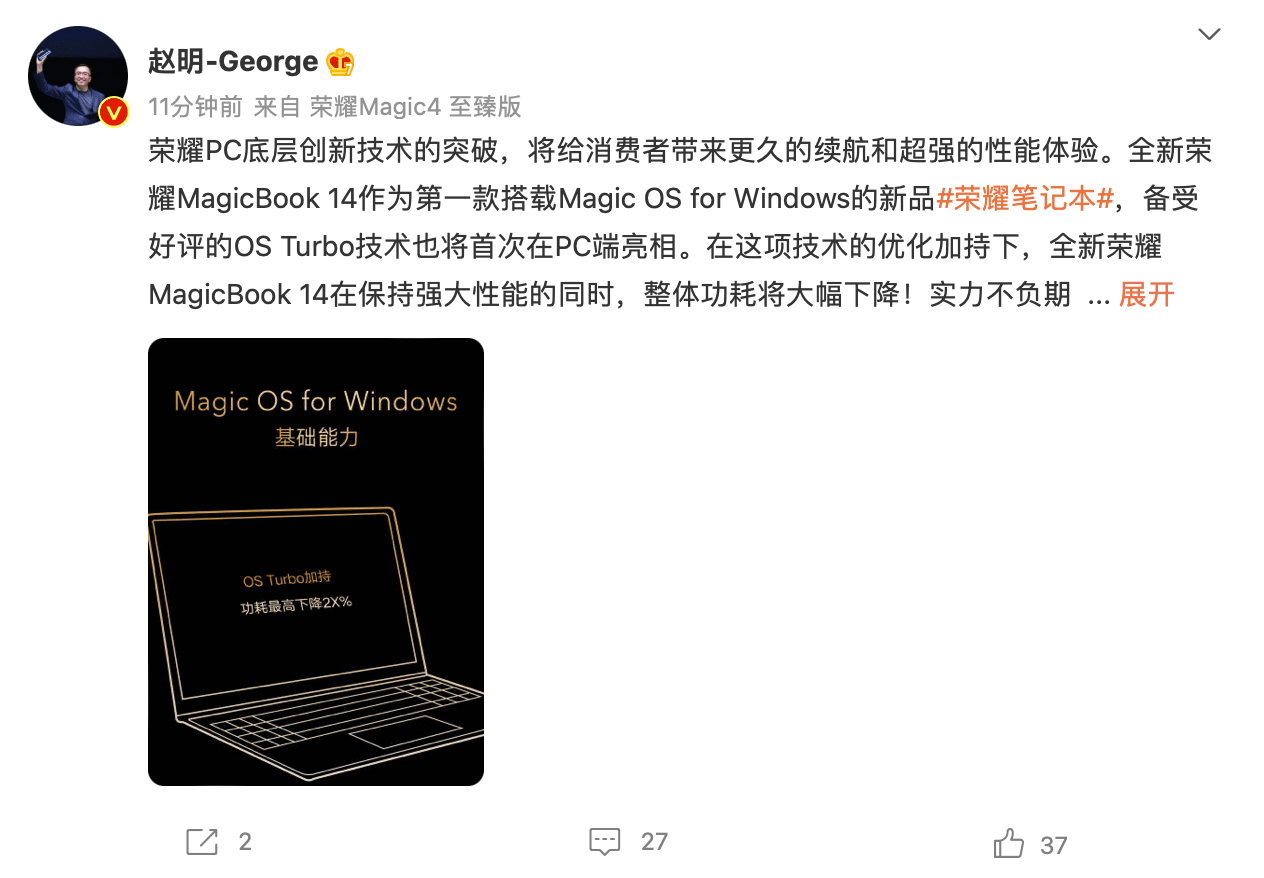 赵明称,MagicBook 14 是第一个用于 Windows 发行的新的魔术操作系统 。Glory OS Turbo技术将首次在个人电脑上提供。通过优化这一技术找到解决这一问题的办法是可行的。魔术书14在保持性能的同时 又有了新的外观整个努力将大大减少。荣耀的海报显示,OS Turbo负责这台笔记本电脑电力使用可减少20%。
