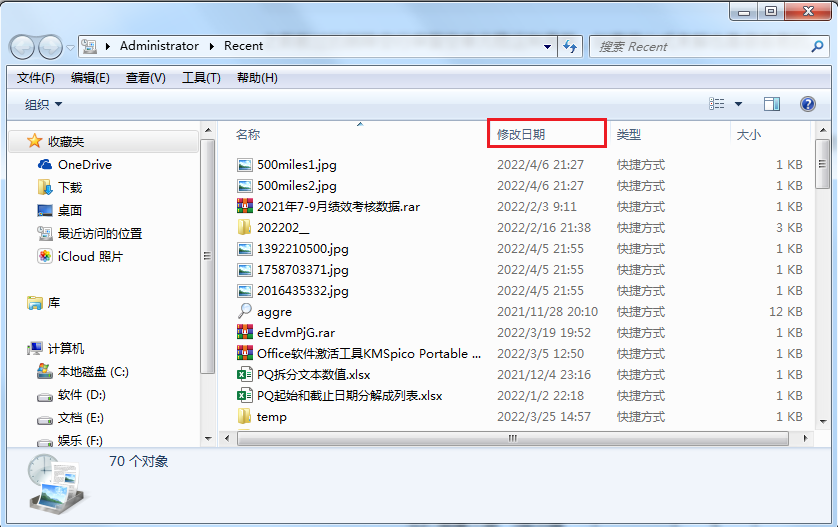 显示所有最近打开的文件, 最近的打开程序可以通过点击“ 修改后的日期” 来发现, 该日期以降序排列 。