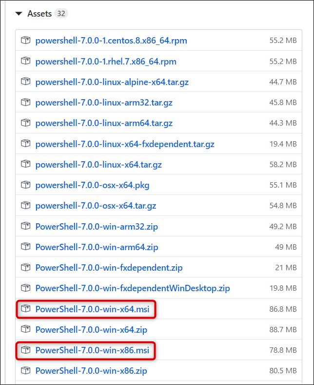 启动浏览器并浏览 PowerShell Github 发布页面。 向下滚到资产部分, 然后单击 MSI 软件包版本下载 。