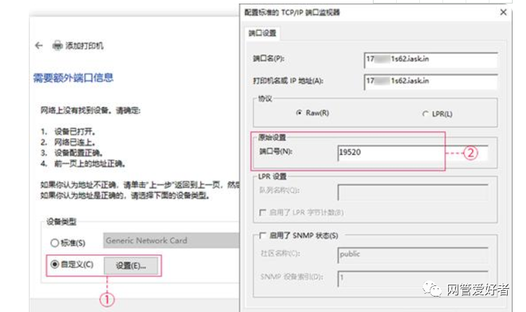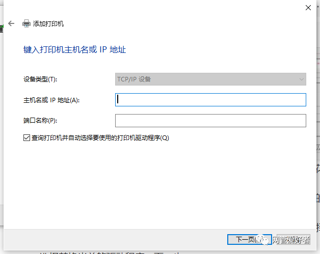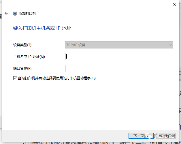 " 主机名或 IP 地址 " 和 " 端口名称 ",花生壳外部地址的域名,下一步,检查打印机并自动选择要使用的打印机驱动程序;