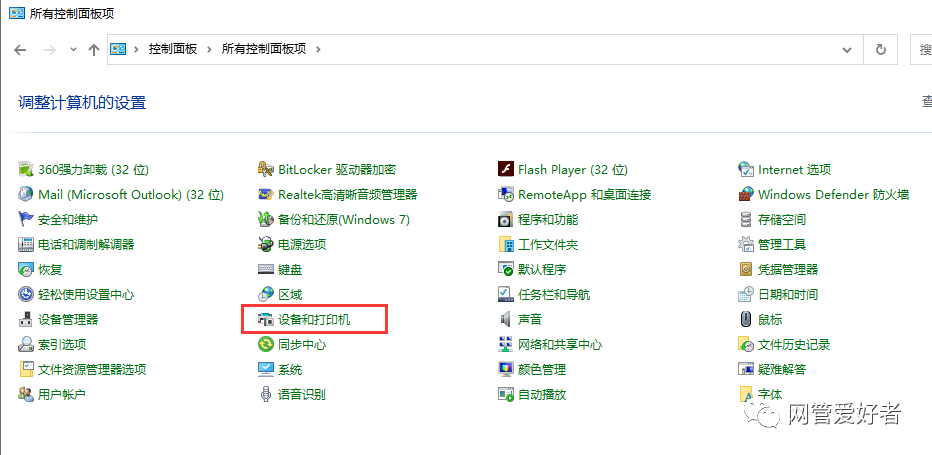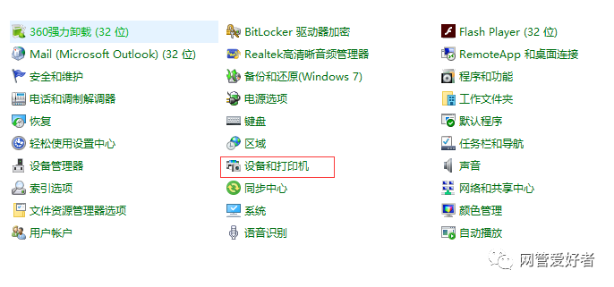 (a) 检查局域网打印机的打印正确,然后在控制面板上找到“设备和打印机”选项。