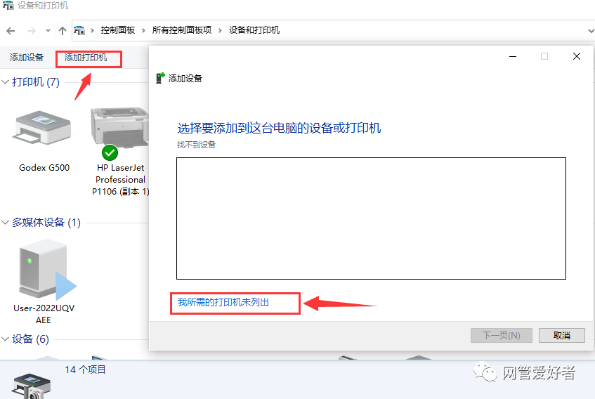下一步选择添加打印机, 此处显示一个窗口, 不提及打印机 ;