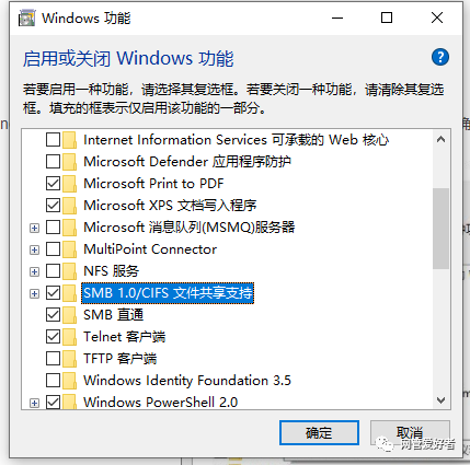 在弹出窗口功能框中查找 SMB 文件共享和支持, 启用它, 单击确认, 安装后重新启动, 并重新启动 。