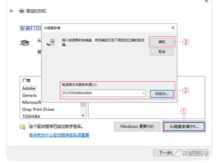 选择“ 从磁盘中完成 ”, 制造商的文件复制源可以选择与打印机驱动程序相对应的目录, 然后单击“ 确定 ” 。