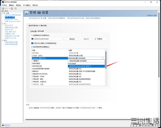 在讨论Windows自己的系统配置后现在让我们看两场N -卡片优化的 NVIDIA 游戏。第一步是配置 NVIDIA 控制面板。在 NVIDIA 控制面板左侧,在 " 3D 设置 " 下选择 " 管理 3D 设置 " 。此外,请看看右边的“方案设置”。将游戏纳入自定义程序 。要创建 GPU, 请选择 OpenGL 。(a) 全球定位系统成像时使用独白。