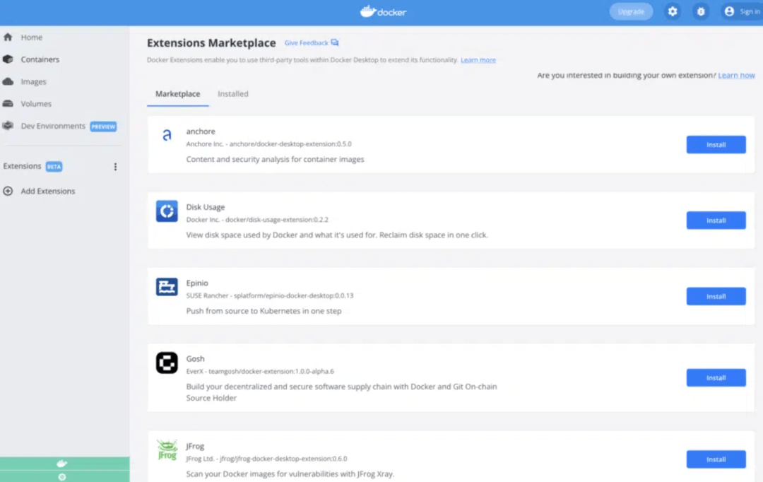 其中值得一提的是,docker 扩展名( 因为 Docker 桌面支持 Linux 平台) https://docs.docker.com/desktop/extensions/ 以及多克交换公司SDK Beta https://docs.docker.com/desktop/extensions-sdk/ 对不起,我不知道,杜克交易所让开发商能够创建新的杜克桌面能力, 增强当前功能,连接第三方工具。