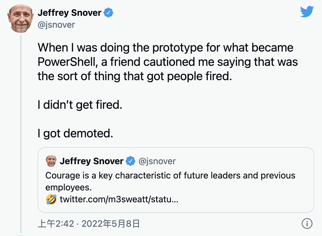 Jeffrey在Twitter上同样坦率地说:「我在想PowerShell是一家创业公司,然而,要取得成功,就必须操作数万个装置。因为我的想法已经发表在Windows上, 它们将被超过10亿台个人电脑使用。我接受了这个事实,我不知道我该怎么办 因为撞击比自我更重要