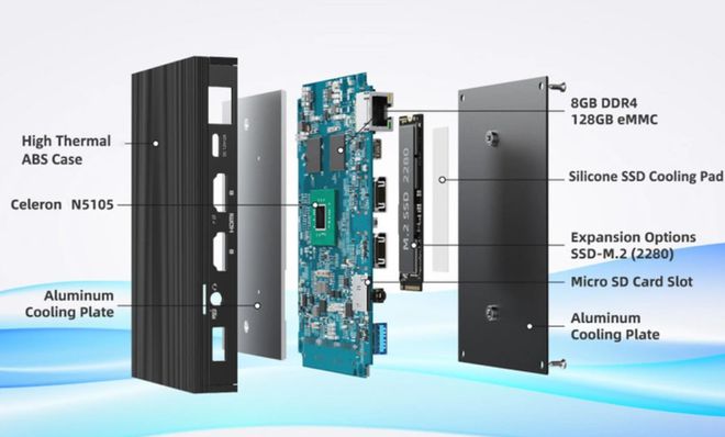 Kingdel M6s的皮肤基于ECS Liva Q3+,但使用了更常见的赛亚人N5105 CPU,飞机为72x72x45毫米,体积为0.23升,重量仅为125克。