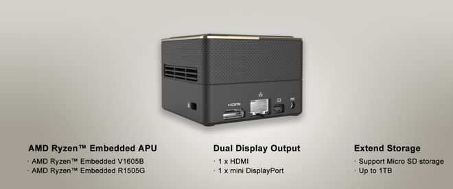 这个紧凑的主机装有:AMD Dragon V1605B IV号八向八向八向式核电聚氯乙烯,15W级;Radeon RX Vega 8型显示器;8GB DD 4-2400内存;128GB EMMc 储存。