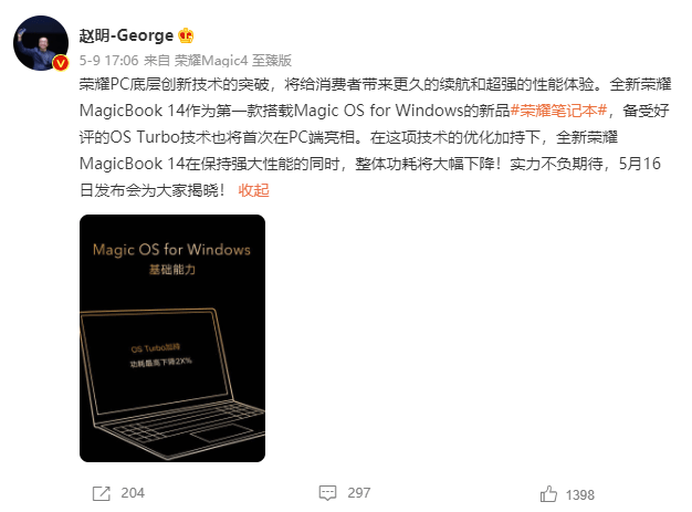 当OS涡轮公司 开始使用个人电脑时也是视窗笔记本电脑的魔力操作系统MagicBook 14的荣耀不仅仅是一个品牌目标,它还将为市场提供新的生活。推动产业创新变革的创新概念。新产品于5月16日正式推出。全新的荣耀笔记本,值得一同期待。