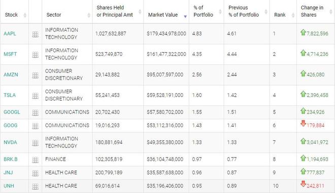微软公司排名第二,拥有的24亿股中约有5个。 在持有的24亿股中,持有的市场价值约为1614亿美元,其中77亿美元左右位居第二,其中大约5亿美元。 在持有的24亿股中,持有的市场价值约为1614.7亿美元。
